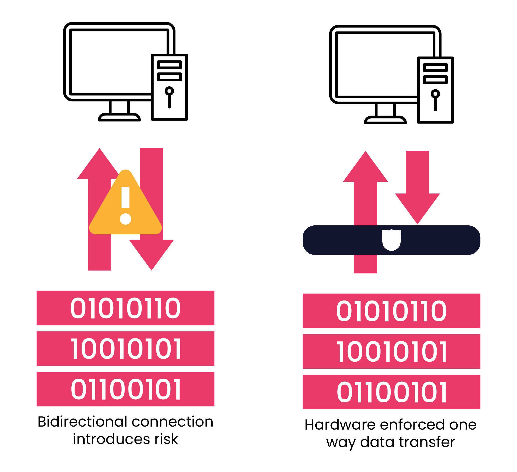 In these designs, a gateway allows information to flow in only one direction, making it impossible for external systems to send commands or malicious traffic into the protected network.